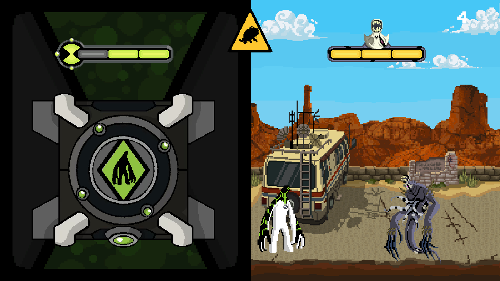 In battle mode, an enemy appears randomly each round. To eliminate the enemy, you must select the right alien that appears in the flashing yellow alert, so that with each hit, the enemy's life is drained by one unit, and the same happens to Ben if the player misses.