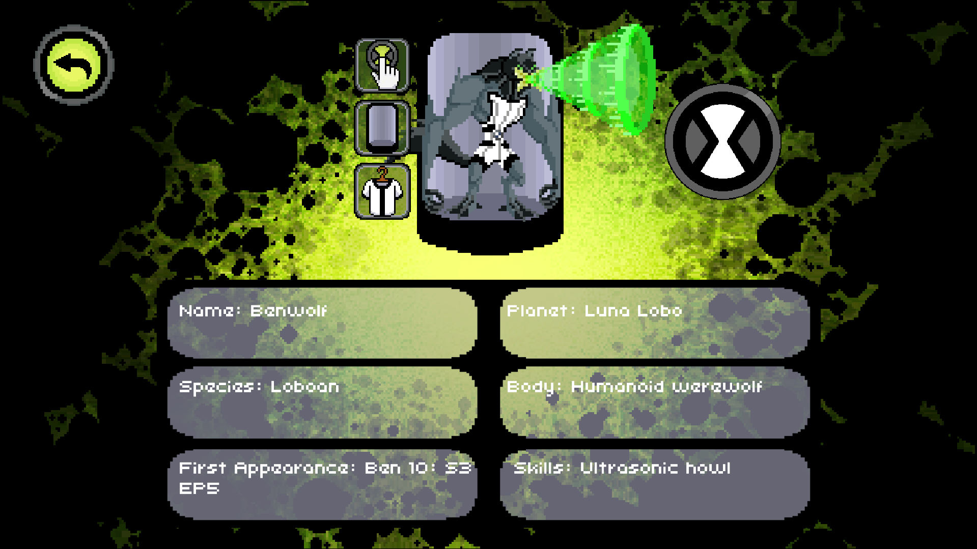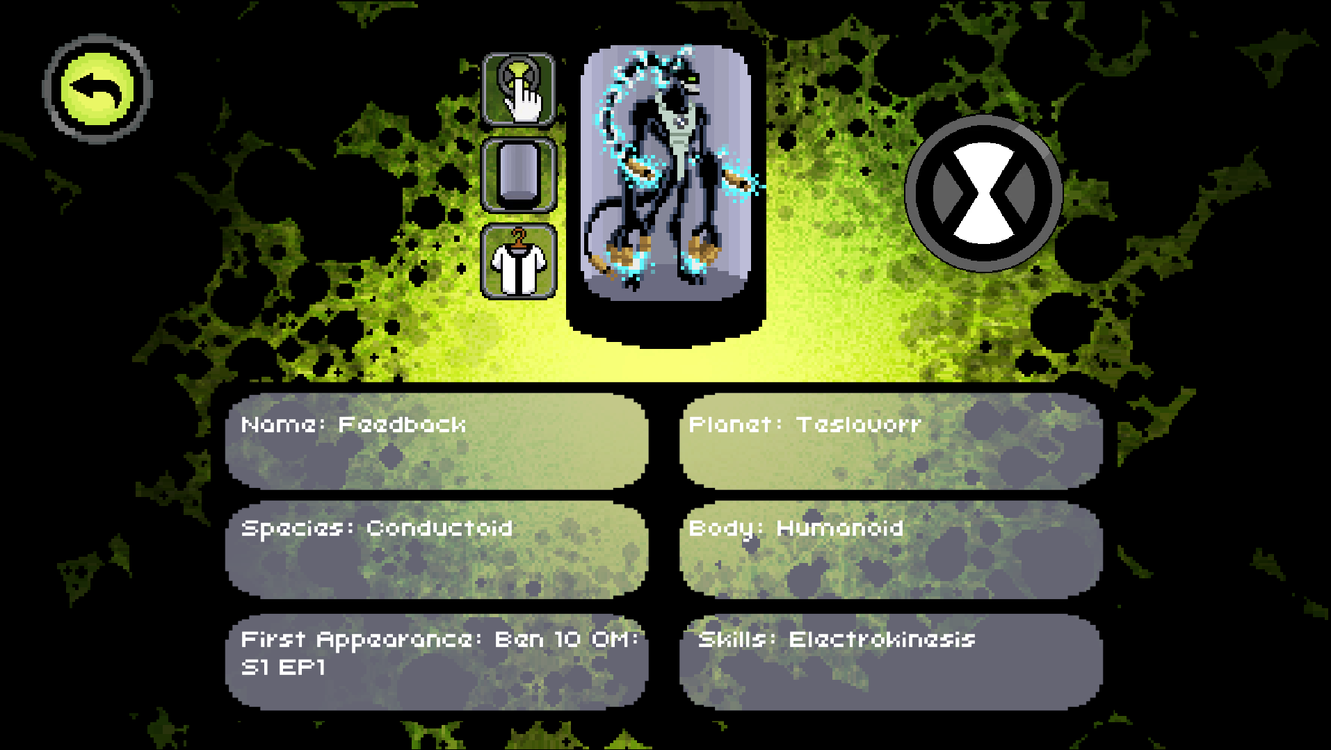 A pixel art Omnitrix simulator that aims to adapt the watches from all parts of Ben 10. In this simulator, you can also access a battle mode and relive Ben Tennyson's best battles in the animation.